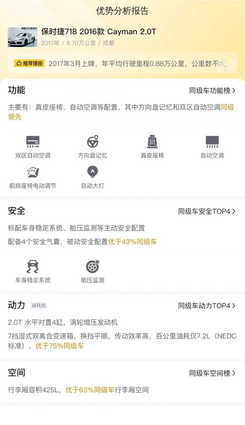 该车具体版本为保时捷718 2016款 Cayman 2.0T,上牌地车源地均为成都,上牌日期2017年3月,表显里程6.7万公里,新车指导价58.8万,该车报价28.3万,过户次数1次。