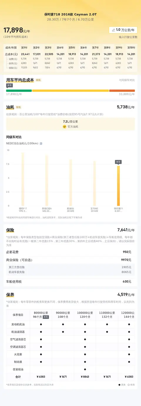 从数据上来看,这款车的百公里油耗为7.2L,每年的保养费用大约为5715元,保险费用约为12754元。总体来说,这款车的使用成本相对较高,但这并不妨碍它成为一款优秀的跑车。