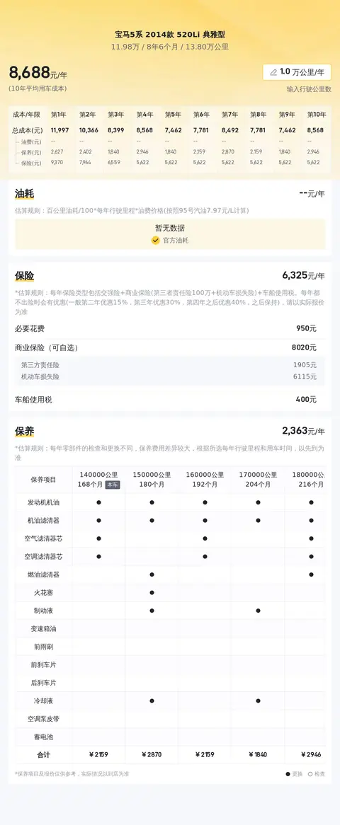 根据估算,这款宝马5系 520LI典雅型的年度用车成本大约为1.4万元左右,具体开支将根据您的使用习惯和维护选择有所变动。