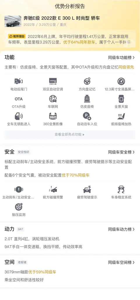 该车具体版本为2022款的奔驰E 300 L 时尚型轿车,上牌地为北京,车源地在北京,上牌时间为2022年6月,过户次数为0次。它的表显里程为3.29万公里,符合国六排放标准。外观颜色为黑色,内饰颜色为深色。新车指导价47.99万,目前二手车报价37.9万。