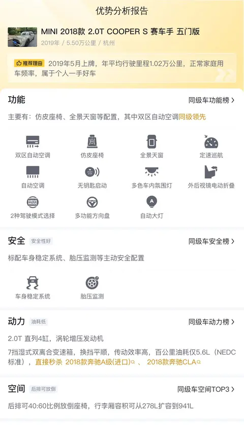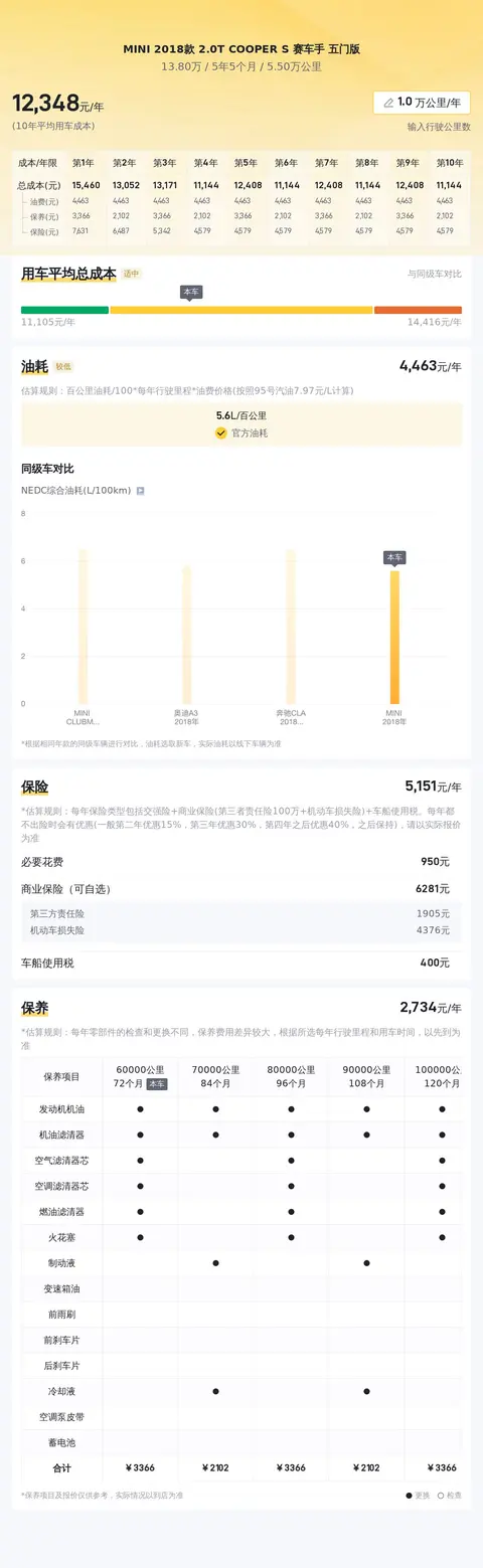 另外,根据估算,这辆二手MINI 2018款 2.0T COOPER S 赛车手 五门版的10年平均用车成本大约是12467元/年,这个用车成本是比较合理的,毕竟油耗不高。