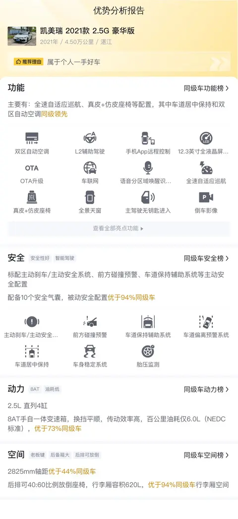 凯美瑞2021款2.5G豪华版在二手车市场上的竞争力主要来自于以下几个方面:首先,它拥有出色的空间表现和舒适的乘坐体验,适合家庭使用;其次,车辆配置丰富,如智能驾驶辅助系统、全景天窗等,提升了驾驶和乘坐的舒适性和便捷性;最后,丰田品牌的口碑和售后服务网络也为车主提供了更多的保障。