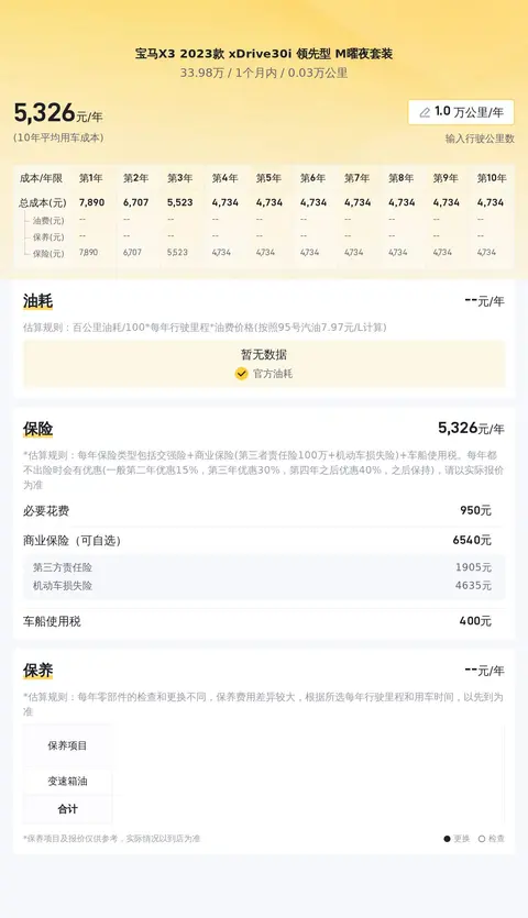 车是好车,价格也得接地气。目前的二手车市场,该车型的价格大概在34.12万-38.75万之间,具体的价格要看车辆的状况而定。而咱们这辆2023款xDrive30i领先型M曜夜套装几乎是准新车,价格却比新車便宜了10多万,性价比杠杠的!另外,该车每年的保险费用大约6298元,保养费用大约4638元,燃油消耗按照百公里8.5L来计算,每年的燃油费用大约7167元。当然啦,实际费用还是要看使用情况和保养质量而定。