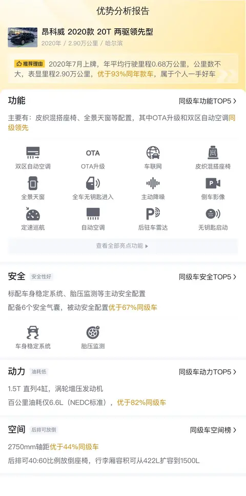 综上所述的新车含税价、用车成本、市场行情、优势分析、同款比价等数据仅供参考。在配置部分,因为二手车非标品,车辆可能会存在配置改装的情况,具体车况信息需要线下结合车辆实际情况进行综合参考。