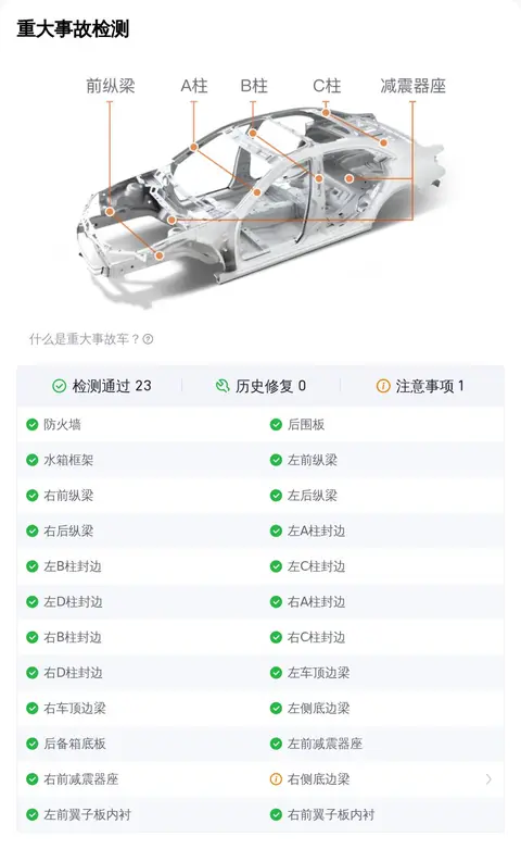 二手车不同于新车,在日常使用中难免会发生一些小意外。比较常见的就是车辆外观覆盖件划伤、剐蹭、划痕、喷漆修复、钣金修复、凹陷、变形等,对于此类小瑕疵,虽然在检测项中会被查出来判定为瑕疵项,但整体并不影响车辆的安全性。总结说一下,如果车辆通过了重大事故、泡水、火烧检测检测,那么说明这辆车的整体车况没有大问题,这个您放心就行。