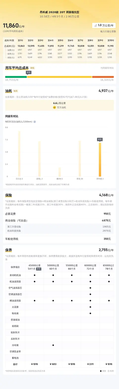 在用车成本部分,我们将通过同级车的最低10年平均用车成本和最高10年平均用车成本,以及本车的10年平均用车成本的对比分析,让您更清晰的了解这款车的用车成本情况。