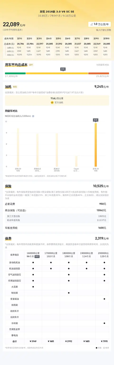 考虑到路虎发现的车型定位和配置水平,再结合当前市场的评估价格,这款车在二手车市场中的性价比还是比较不错的。对于那些追求驾驶乐趣、注重舒适性和实用性,并且预算有限的消费者来说,路虎发现2016款3.0 V6 SC SE版无疑是一个值得考虑的选择。但需要注意的是,路虎品牌的维修保养成本相对较高,这一点需要买家在购买前做好心理准备和经济准备。