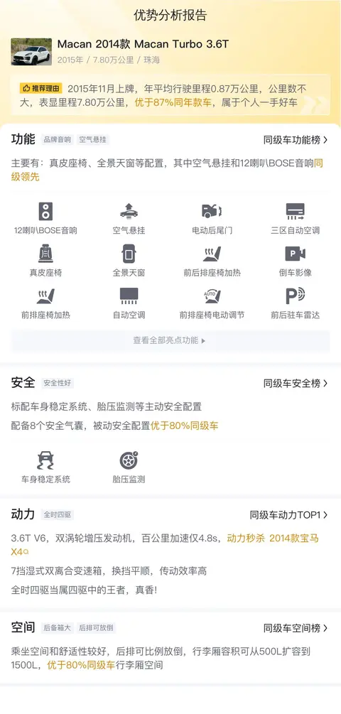 当前市场上,这款Macan的二手车价格区间大致在27万至33万左右,当然具体价格还是要看车况而定。作为Turbo性能版,在维护和燃油消耗方面自然会稍高于普通版本,但考虑到其出色的性能表现和豪华配置,这些成本似乎就成了“物有所值”的代名词了。