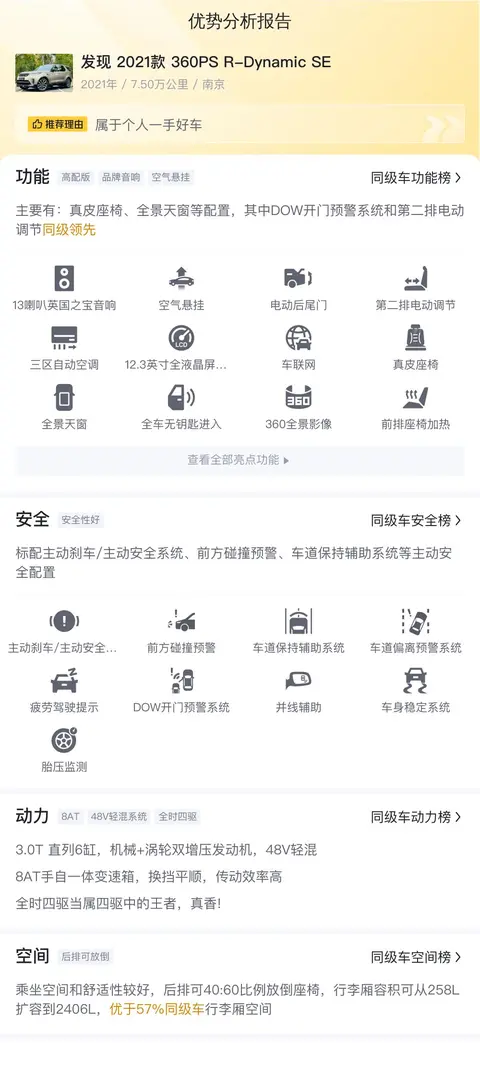 先介绍一下这辆车的基本信息,该车的具体版本是——发现 2021款 360PS R-Dynamic SE。该车车源所在地和上牌所在地均为南京。该车新车含税价为86.38万,而现在的二手车报价为38.27万,2021年9月首次上牌,期间过户0次。表显里程7.5万公里,符合国VI排放标准。车身外观为香槟色,内饰为深色配色。