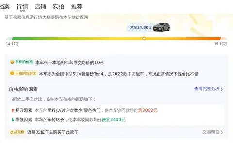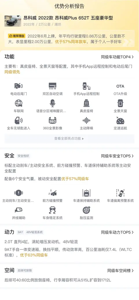 综上所述的新车含税价、用车成本、市场行情、优势分析、同款比价等数据仅供参考。在配置部分,因为二手车非标品,车辆可能会存在配置改装的情况,具体车况信息需要线下结合车辆实际情况进行综合参考。