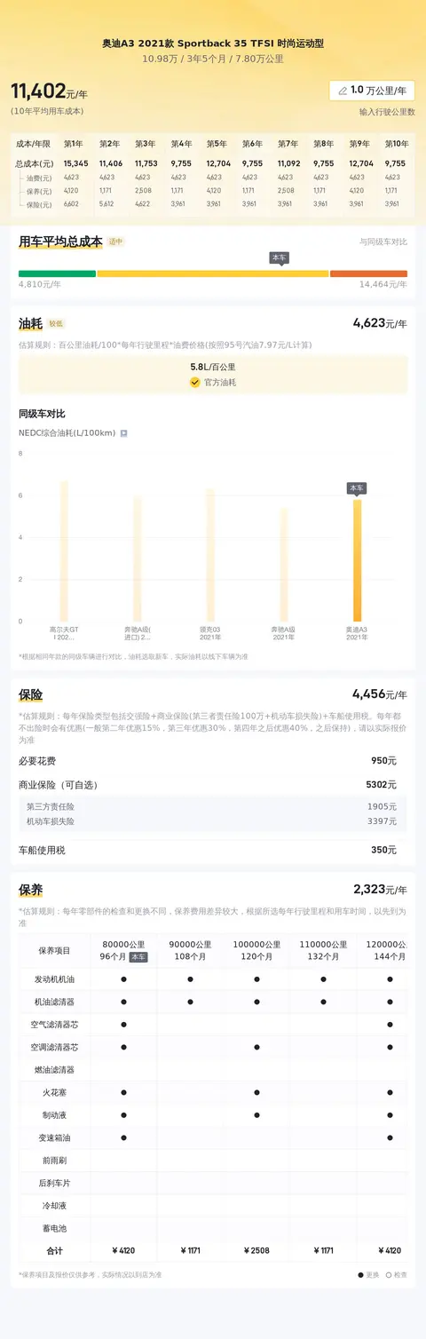 最后说一下这辆车的性价比,奥迪A3 2021款 Sportback 35 TFSI 时尚运动型新车含税价为24.35万,而现在这辆二手车只需要10.98万,相当于开了3年多便宜了13.37万,而且这辆奥迪A3 2021款 Sportback 35 TFSI 时尚运动型车况良好,行驶里程只有7.80万公里,所以性价比还是非常不错的。