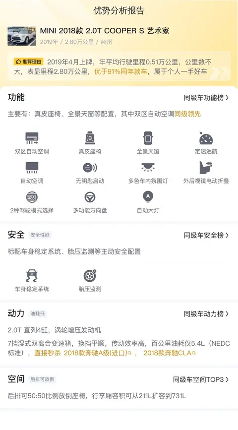 我们精心分析了海量二手车数据,只为给你呈现最真实的市场价值。这辆二手MINI 2018款 2.0T COOPER S 艺术家,它的售价在二手车市场上可是相当有竞争力的。数据显示,它的售价合理区间为15.47万至16.81万,而咱们这儿给出的15.68万的价格,不仅性价比超高,更重要的是,这样的车况,这样的价格,在二手市场上可是打着灯笼都难找的哦~