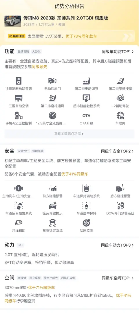 综上所述,传祺M8 2023款 宗师系列 2.0TGDI 旗舰版在配置、动力、空间部分还是有不少亮点的。结合这辆车24.58万元的二手车报价来看,如果您正在寻找一款中国品牌的MPV车型,并且对配置要求较高的话,这辆车还是值得考虑的。当然,具体如何选择,还是要看您自己拿主意。