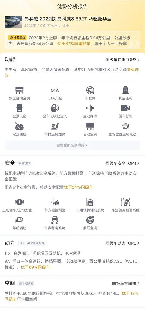 综上所述的新车含税价、用车成本、市场行情、优势分析、同款比价等数据仅供参考。在配置部分,因为二手车非标品,车辆可能会存在配置改装的情况,具体车况信息需要线下结合车辆实际情况进行综合参考。