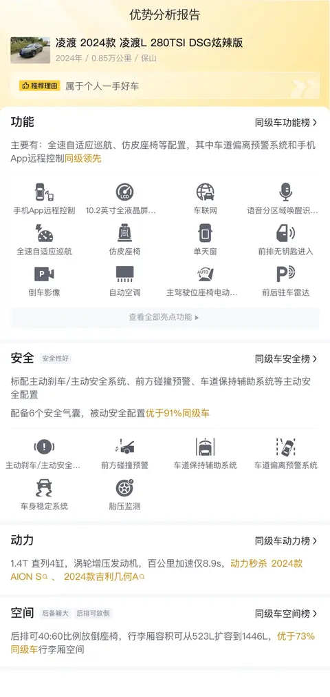 大众凌渡在外观设计、动力性能、车身尺寸等方面具有明显优势。外观采用了大众家族的最新设计理念,时尚动感,受到年轻消费者的青睐。动力性能出色,搭载了高性能的发动机,满足日常出行和高速行驶的需求。车身尺寸宽敞,乘坐舒适,储物空间丰富,适合家庭使用。然而,凌渡凌渡L 2024款 280TSI DSG炫辣版作为一款全新的车型,目前尚未发现明显的劣势,但个别用户反映该车存在胎噪大、底盘较硬等问题,可能会对驾乘体验造成一定影响。建议潜在消费者在购买前进行充分的试驾和评估,以确保该车型能够满足自身的用车需求和偏好。