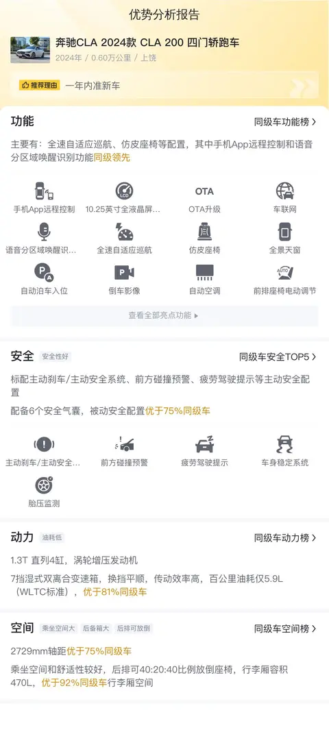 在配置方面,这款CLA 2024款 CLA 200四门轿跑车配备了全景天窗、倒车影像、前后驻车雷达、定速巡航、CarPlay/CarLife等实用配置,其中MBUX智能人机交互系统和全景天窗同级领先。动力方面,搭载1.3T发动机,匹配7速双离合变速箱,动力表现中规中矩。