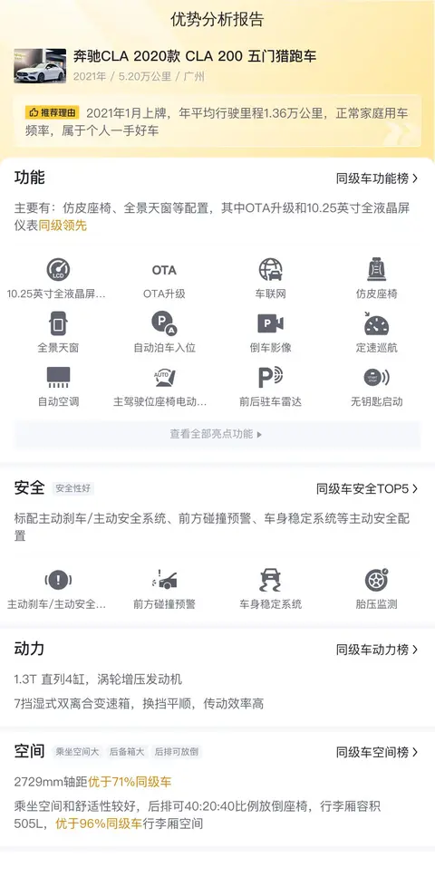 如果你正在寻找一辆既能满足日常出行需求,又能彰显个性与品味的二手车,那么这辆奔驰CLA 2020款 CLA 200 五门猎跑车绝对是你的不二之选。它不仅拥有出色的外观和内饰设计,更在动力、安全和舒适性等方面表现出色。更重要的是,它的价格非常亲民,是一款性价比极高的豪华轿车。如果你想要一辆既能让你在路上引人注目,又能给你带来愉悦驾乘体验的二手车,那么这辆奔驰CLA级轿车绝对值得你考虑。毕竟,它可能会成为你生活中不可或缺的伙伴,陪伴你度过无数美好的时光。