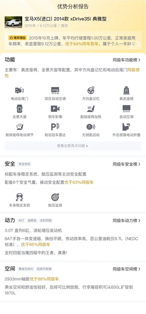 我们今天介绍的这辆宝马X5(进口) 2014款 xDrive35i 典雅型,定位是中大型SUV,车身外观颜色为白色,内饰是深色配色。车源地和上牌地都在南京。至今累计行驶里程是9.12万公里,该车符合国IV排放标准。2015年10月首次上牌,期间过户0次。新车含税价为91.58万,现在的二手车报价是17.98万。