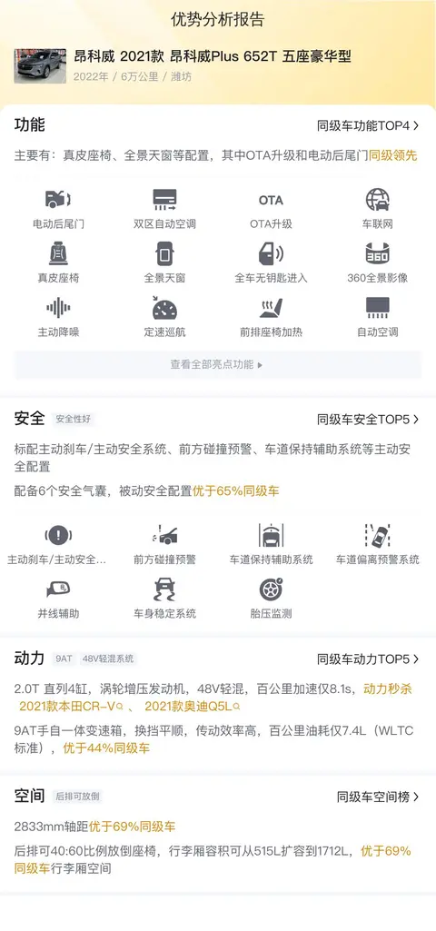 综上所述,昂科威Plus 2021款 652T 五座豪华型作为一款集豪华与性能于一身的中型SUV,在市场上享有良好的口碑。它在内饰、科技配置、动力以及空间布局等方面均表现出色,特别适合追求舒适性和科技感的现代家庭使用。作为一辆二手车,这辆昂科威Plus 2021款 652T 五座豪华型整体车况良好,性价比高,对于想要购买昂科威Plus但预算有限的消费者来说,无疑是一个不错的选择。