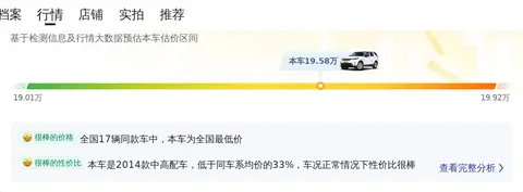 在二手车市场中,发现 2014款 3.0 V6 SC HSE的市场价格在19.01-23.85万,而本辆车的报价为19.58万,价格相对较低,是一个不错的优势。