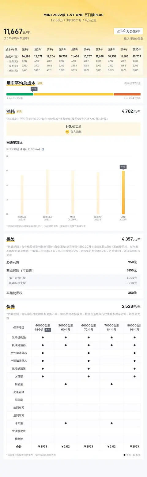 养车成本方面,按照懂车帝的大数据分析,这款二手MINI 2022款 1.5T ONE 五门版PLUS每年的养车成本大约在1.2万元左右,其中包括油费、保险费、保养费等各项费用。这个养车成本在同级别车型中处于中等偏下的水平,比较适