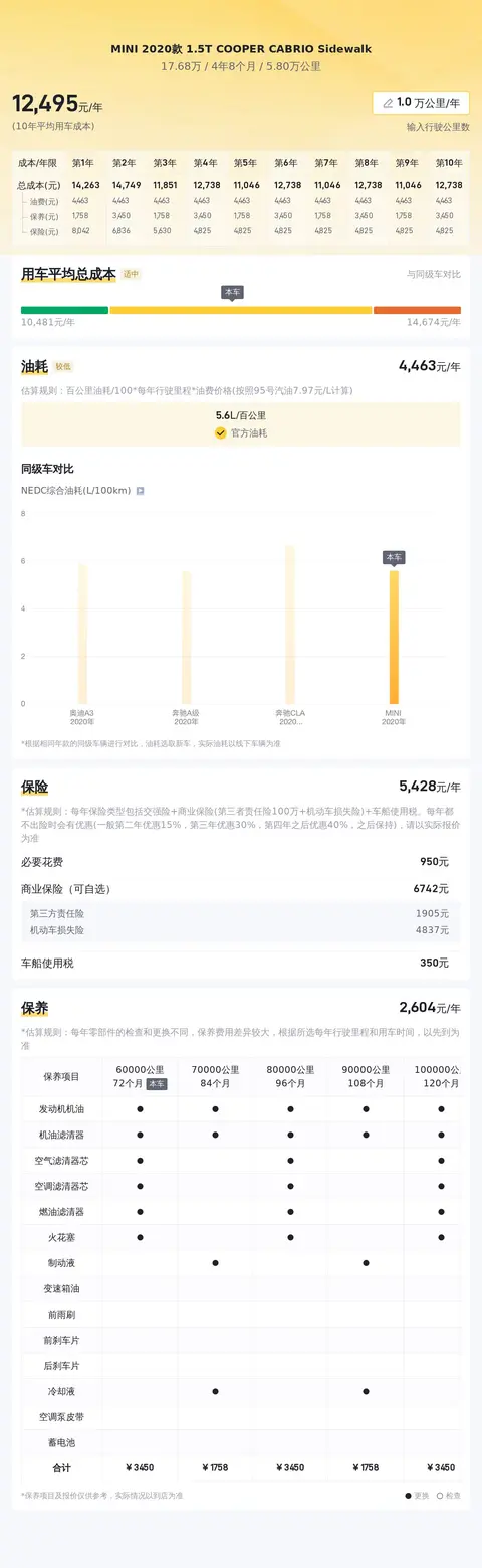 不过,据估算,MINI 2020款 1.5T COOPER CABRIO Sidewalk的用车成本也较高,因为同级车最低用车成本是4777元/年,最高是14777元/年,而MINI 2020款 1.5T COOPER CABRIO Sidewalk的是12180元/年。