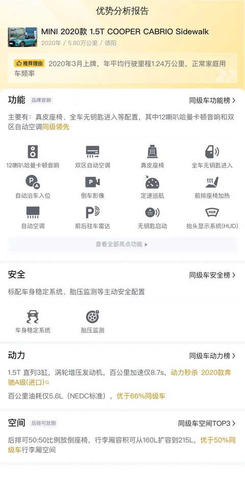 对于追求个性和品味的消费者来说,MINI在设计、品牌魅力方面的优势自不用多说。从实用性角度来说,这辆MINI 2020款 1.5T COOPER CABRIO Sidewalk配置丰富,尤其是哈曼卡顿音响和语音控制等功能提升了使用便利性和舒适性。同时,作为一款敞篷车,它能带来的驾驶乐趣和回头率也是其他车型比不了的。不过动力孱弱和空间较小依然是MINI的硬伤,如果只是个人代步还则罢了,家庭用车的话就不太行了。