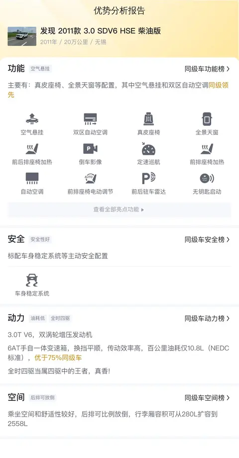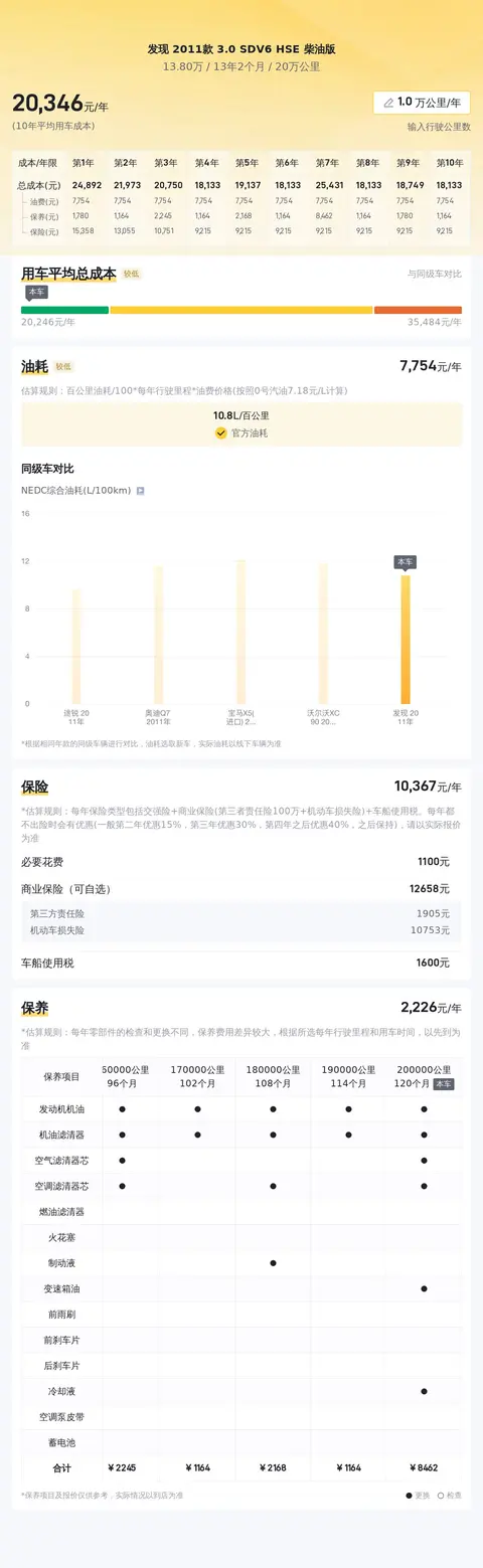 据估算,同级车的最低用车成本是17981元/年,最高是31774元/年,发现 2011款 3.0 SDV6 HSE 柴油版是20860元/年,用车成本较低,具有一定优势。