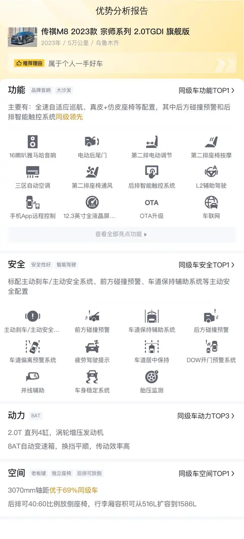 综上所述的新车含税价、用车成本、市场行情、优势分析、同款比价等数据仅供参考。在配置部分,因为二手车非标品,车辆可能会存在配置改装的情况,具体车况信息需要线下结合车辆实际情况进行综合参考。