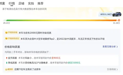 综上所述的新车含税价、用车成本、市场行情、优势分析、同款比价等数据仅供参考。在配置部分,因为二手车非标品,车辆可能会存在配置改装的情况,具体车况信息需要线下结合车辆实际情况进行综合参考。