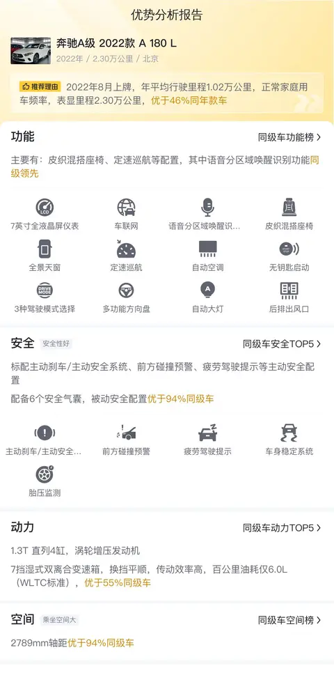 这辆二手奔驰A级2022款 A 180 L是一款集时尚设计、精致工艺和丰富配置于一身的紧凑型豪华轿车。它在动力性能、内饰品质、智能科技以及安全配置等方面均表现出色,适合追求品质生活的年轻消费者、注重品牌和形象的城市白领以及热爱驾驶且讲究生活品质的人士。无论您是日常通勤还是偶尔周末出游,它都能为您提供出色的驾驶体验和舒适的乘坐感受。总的来说,如果您正在寻找一款既有颜值又有实力的紧凑型豪华轿车,二手市场的奔驰A级2022款 A 180 L绝对值得您考虑。当然,每一辆二手车都有其独特的情况,只有综合车况等信息,才能判断价格是否合理。