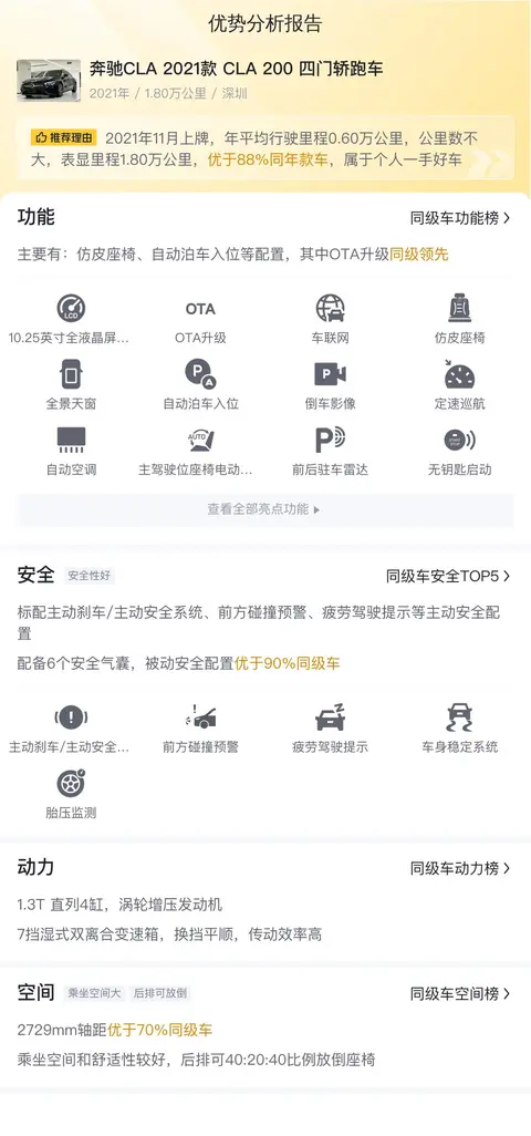 奔驰CLA 2021款 CLA 200 四门轿跑车,新车含税价为32.76万,现在的二手车报价是17.98万,2021年11月首次上牌,在此期间过户0次。