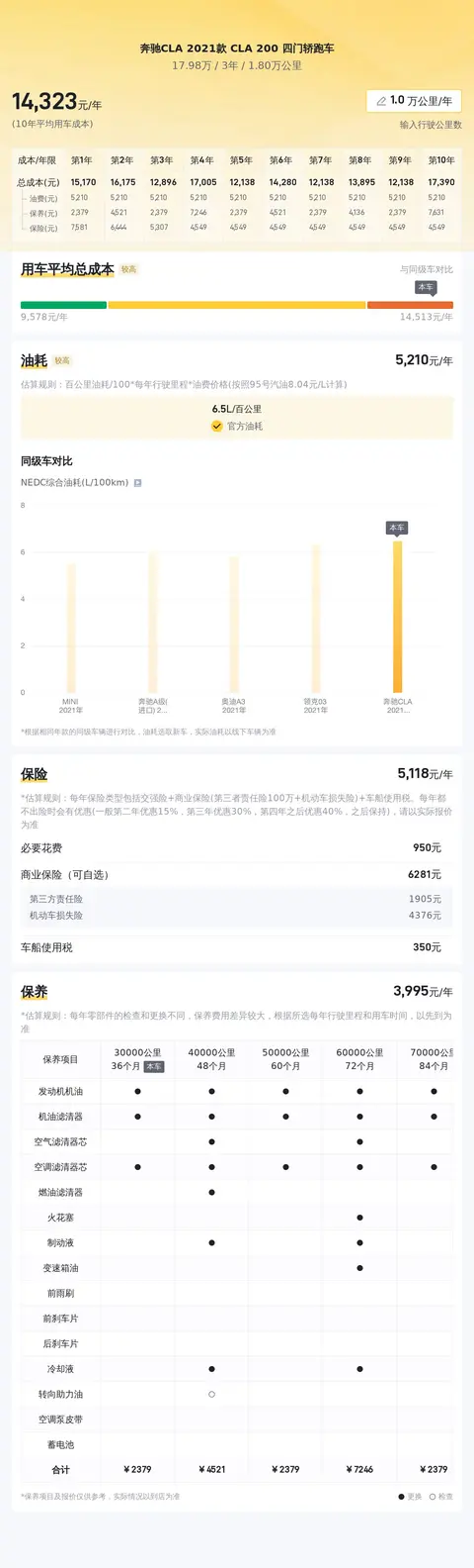 据估算,同级车的最低用车成本是6505元/年,最高是16398元/年,奔驰CLA 2021款 CLA 200 四门轿跑车是14138元/年,所以用车成本适中。