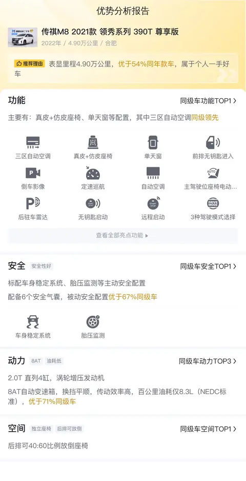 接下来,我们看看传祺M8 2021款 领秀系列 390T 尊享版在配置、安全、空间上有哪些优势和不足。