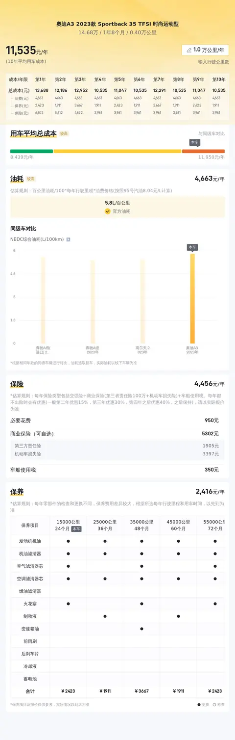 同时根据估算,同级车的最低用车成本是5678元/年,最高是13731元/年,奥迪A3 2023款 Sportback 35 TFSI 时尚运动型是12131元/年,用车成本也较高。