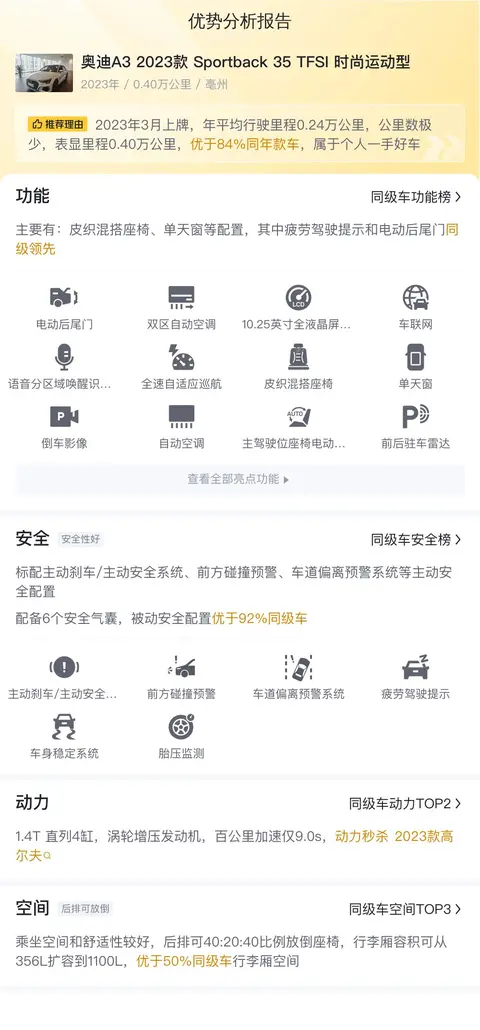 这辆奥迪A3 2023款 Sportback 35 TFSI 时尚运动型的优势非常明显,作为一款2023年5月份才上市的新车,这辆车于2023年3月份上牌,可以说与新车没什么区别,并且行驶里程较少,整车状况非常良好。再者,这一款奥迪A3的配置也比较高,配备了全速自适应巡航、10色车内氛围灯、语音分区域唤醒识别、电动后尾门等配置,都是比较实用的配置。最后,这一款奥迪A3的百公里油耗为5.8L,燃油经济性比较好,适合家庭用车。