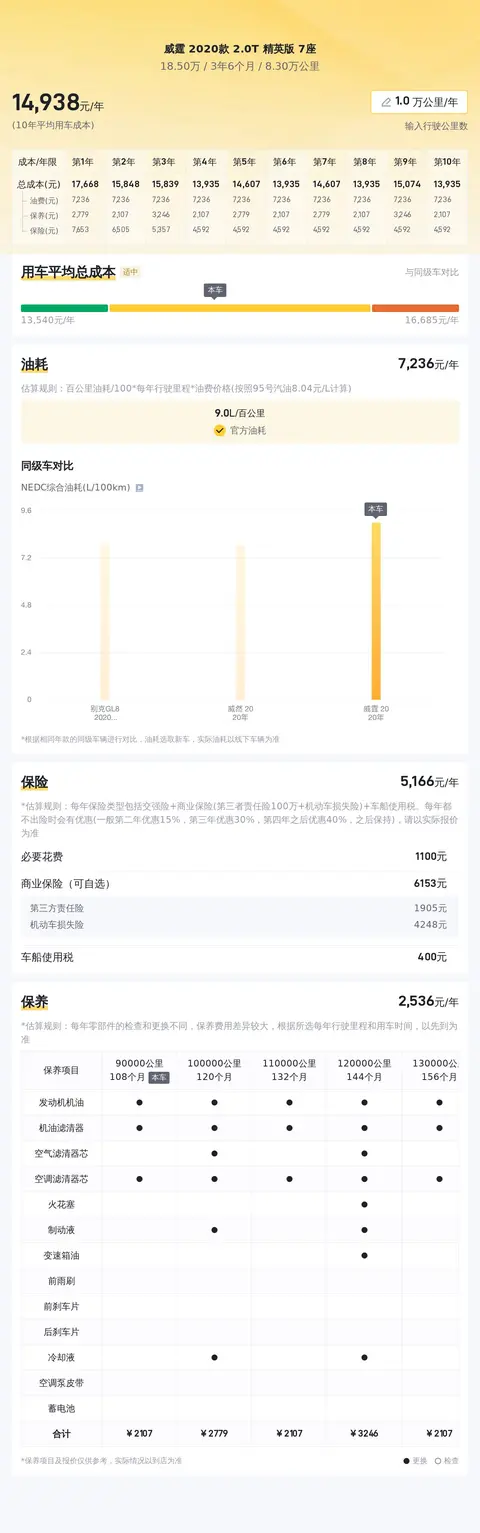 关于用车成本方面,根据估算,这辆威霆的年均综合用车成本大约在1.5万元左右。这项开支的具体金额跟车主的驾驶习惯及行车环境等因素有直接关系。