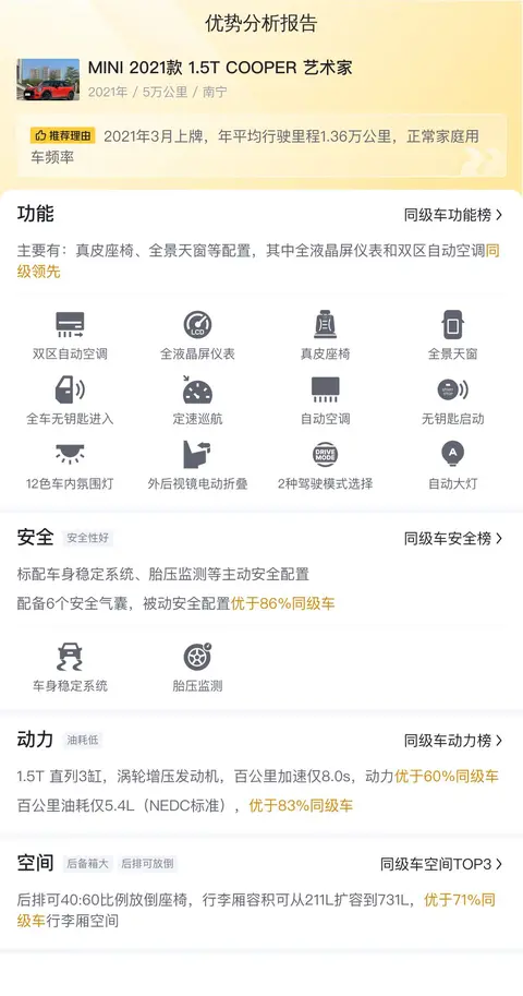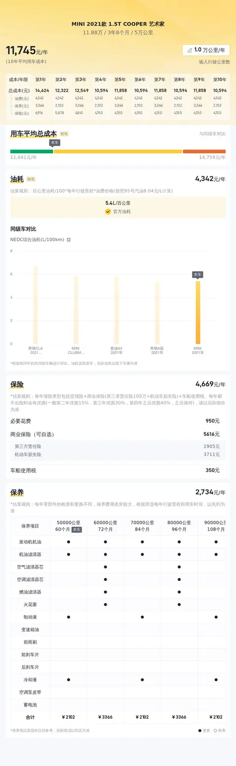 据估算,同级车的最低用车成本是5178元/年,最高是13771元/年,而MINI 2021款 1.5T COOPER 艺术家是12345元/年,所以用车成本偏高。