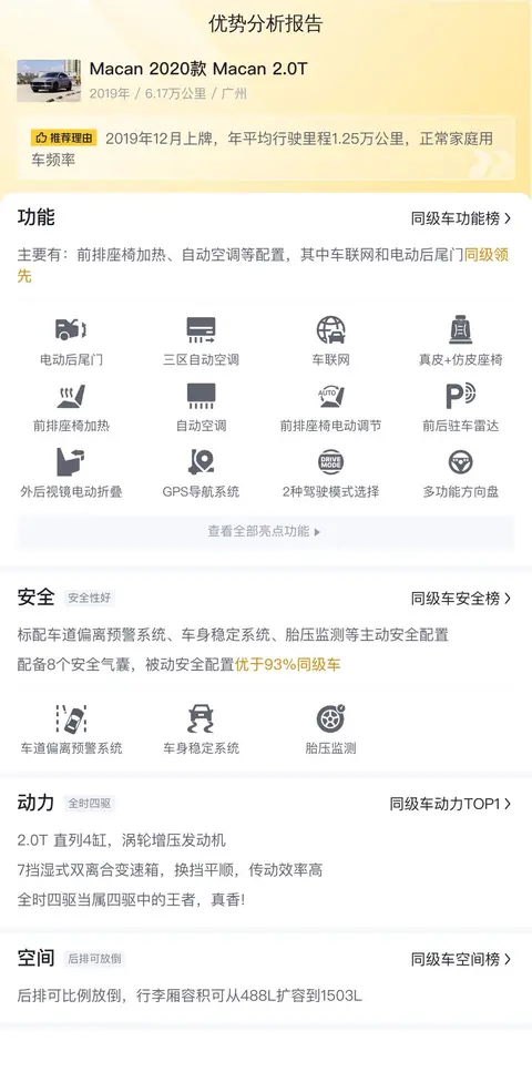 这款Macan 2020款 Macan 2.0T在多个方面展现了其产品优势。首先,其2.0T直列4缸涡轮增压发动机提供了出色的动力性能,同时7挡湿式双离合变速箱确保了高效的能源利用与平顺的驾驶体验。其次,车辆的空间设计合理,既保证了乘坐的舒适性,也满足了储物的需求。再者,Macan的内饰采用了高品质的材料,如真皮和仿皮座椅,不仅提升了车内的豪华感,也彰显了保时捷品牌的精致工艺。最后,车辆配备了多项先进的驾驶辅助系统,如多功能方向盘和大屏中控等,提升了驾驶的安全性和便捷性。综合来看,这款Macan在动力性能、空间设计、内饰品质以及驾驶辅助系统等方面均表现出色,是一款集豪华与实用于一体的优质车型。
