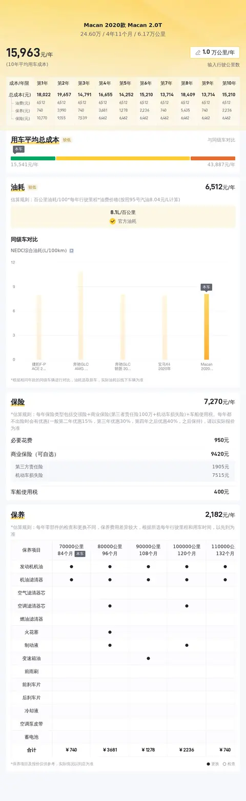 在用车成本方面,这款Macan的年均综合用车成本约为1.6万元,这一数字涵盖了燃油、保养以及保险费用等日常用车开支。值得注意的是,由于Macan搭载了一款高性能的2.0T发动机,其燃油消耗可能会相对较高,这是潜在车主在购买前需要考虑的因素之一。