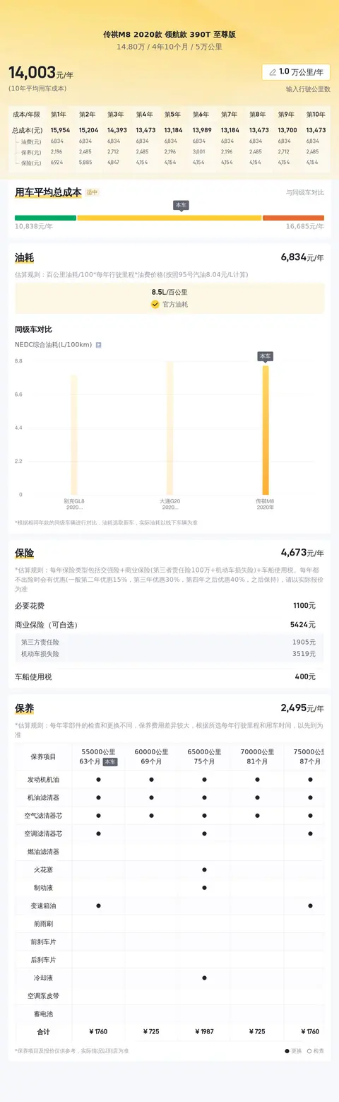 市场行情也是决定这款车价值的重要因素。目前,这款传祺M8的二手车行情大致在12万至15万之间波动。用车成本也是每个车主必须考虑的实际情况。根据估算,这辆传祺M8的年均综合用车成本在1.4万元左右,当然具体用车成本金额还是根据车辆的实际使用情况而决定的。