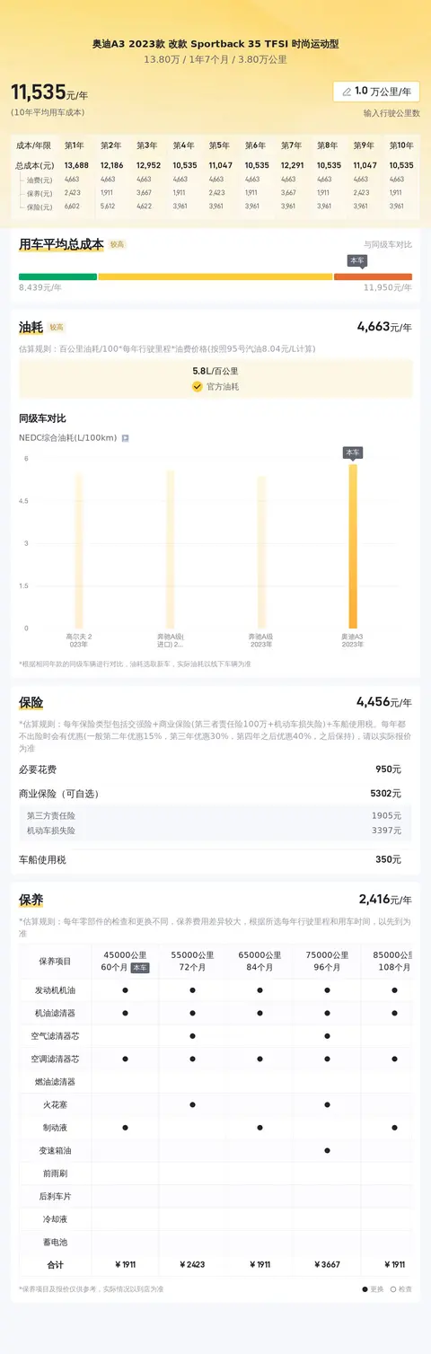 接下来,我们来看看这款车的市场行情。目前,这款奥迪A3的二手车行情大致在11.13万至13.15万之间。用车成本方面,根据估算,这辆车的年均综合用车成本约为1.2万元左右。当然,具体的用车成本还是要根据车辆的实际使用情况和保养情况来确定。