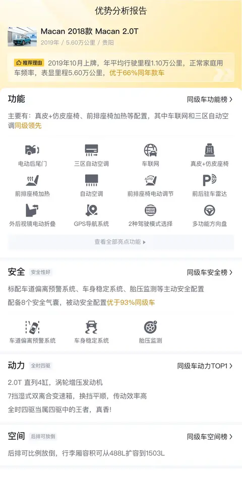 据估算,Macan 2018款 Macan 2.0T的用车成本是18473元/年,同级车最低是18473元/年,最高是46810元/年,所以用车成本偏低。