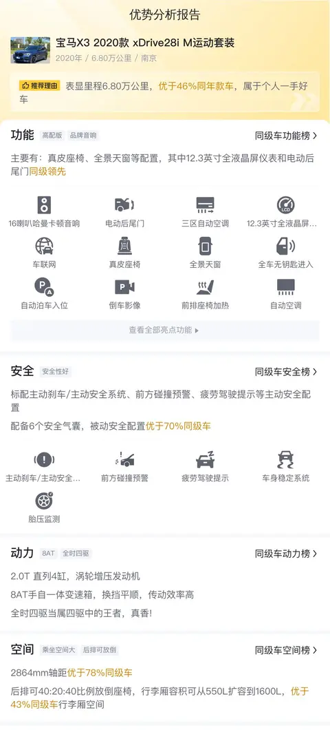 接下来,我们聚焦于大家普遍关心的车辆状况。这辆宝马X3 2020款 xDrive28i M运动套装已行驶6.8万公里,首次上牌时间为2020年6月,车源地与上牌地均为南京。车况良好,车身颜色为蓝色,目前该车未进行过过户,符合国VI排放标准。