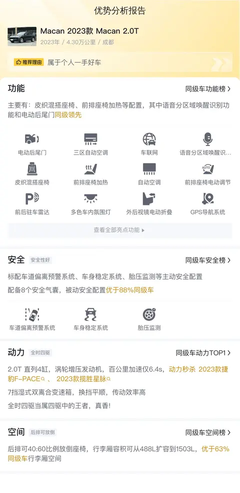 综上所述,这辆Macan 2023款 Macan 2.0T在动力性能和配置方面表现不错,同时行李厢空间大,为出行提供了便利。然而,其维护成本较高,且随着车龄的增长,保养费用也会增加。此外,保时捷品牌的街车属性可能不符合某些消费者追求个性和差异化的需求。