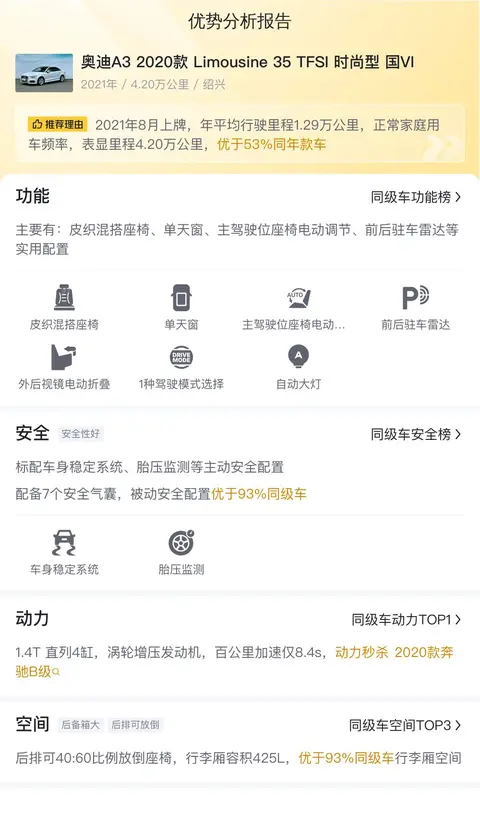 这辆奥迪A3 2020款 Limousine 35 TFSI 时尚型 国VI定位是紧凑型车,车身外观颜色是白色,内饰是深色配色。累计行驶里程是4.20万公里,该车符合国VI排放标准。