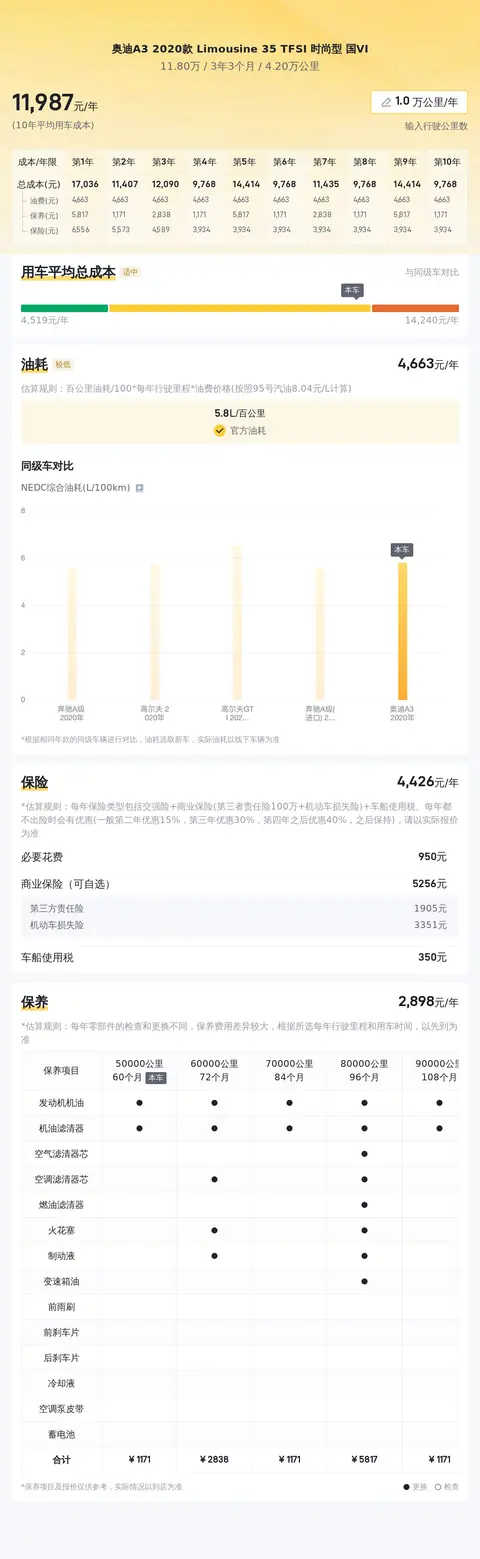 这辆奥迪A3 2020款 Limousine 35 TFSI 时尚型 国VI的10年平均用车成本是12180元/年,同级车的最低是10802元/年,最高是13738元/年,它的用车成本不算低。