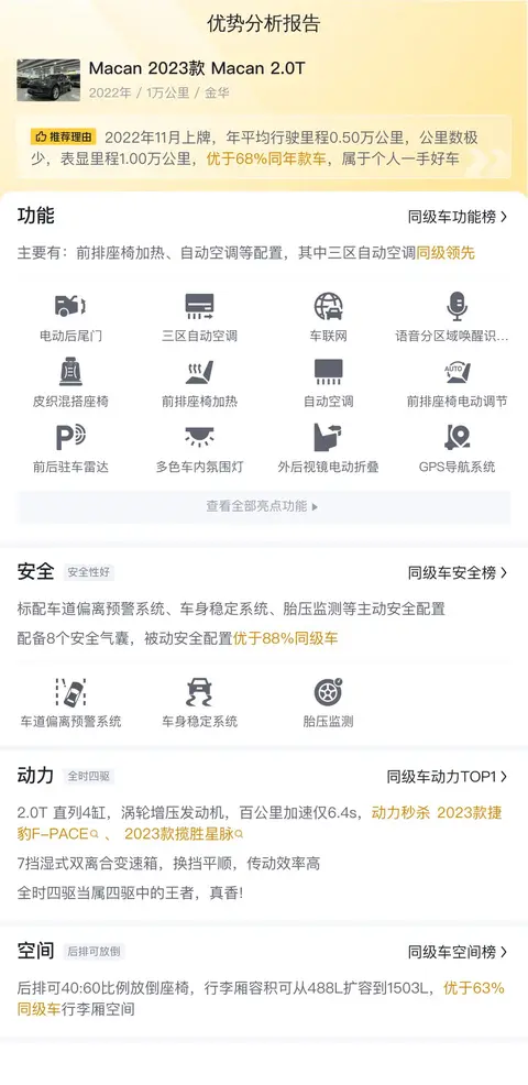 该车的具体版本是——2023款Macan 2.0T,表显里程1.1万公里,上牌日期2022年11月,车源地和上牌地均为金华,车身颜色为深灰色,新车指导价57.3万,目前二手车报价46.8万,过户次数0次。