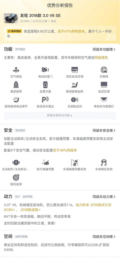 优势方面,这辆发现 2018款 3.0 V6 SE的配置还算丰富,毕竟有当年新车售价80多万的老底子在那摆着,该有的豪华配置都有。最关键的是这辆发现 2018款 3.0 V6 SE的行驶里程只有9.6万公里,集中爆发的故障点基本上都会出现在10万公里之后,所有这辆车大概率可以避免。