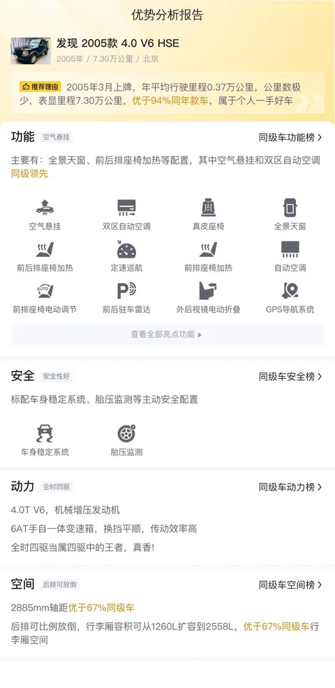 综合来看,这辆发现 2005款 4.0 V6 HSE的可说之处还是很多的,首先这个仅有7.3万公里的行驶里程就非常少见,要知道这可是一辆19年前的老车!其次这辆车并未经过户,属于一手好车,再加之这辆车的动力储备非常充足,所以喜欢越野,喜欢老车的车友们可以多多关注一下这辆车。